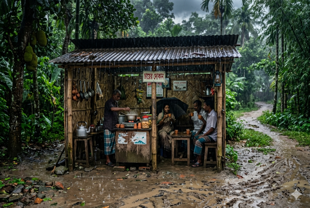 A small village tea stall made of bamboo and tin roof during heavy rain, muddy ground, natural greenery around, soft diffused light, peaceful rural atmosphere, ultra realistic photography –ar 3:2
