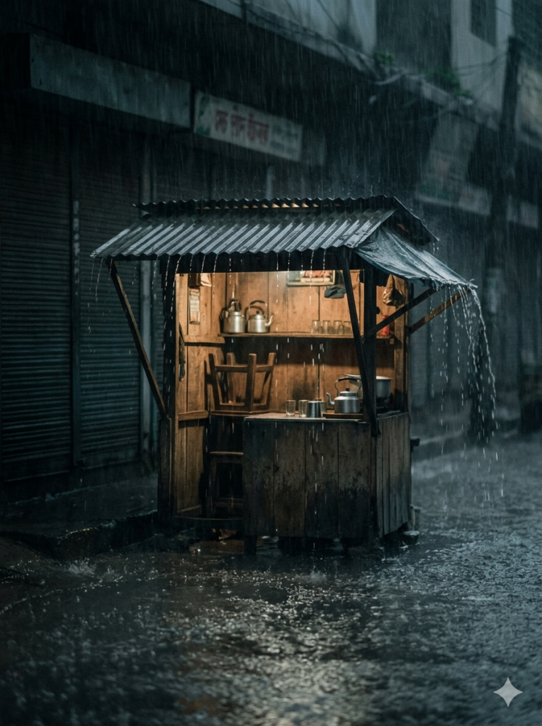 A quiet, emotional scene of a single tea stall in heavy rain, empty surroundings, dim light glowing from inside, rain falling in slow motion, melancholic mood, film still style, soft cinematic tones –ar 3:4