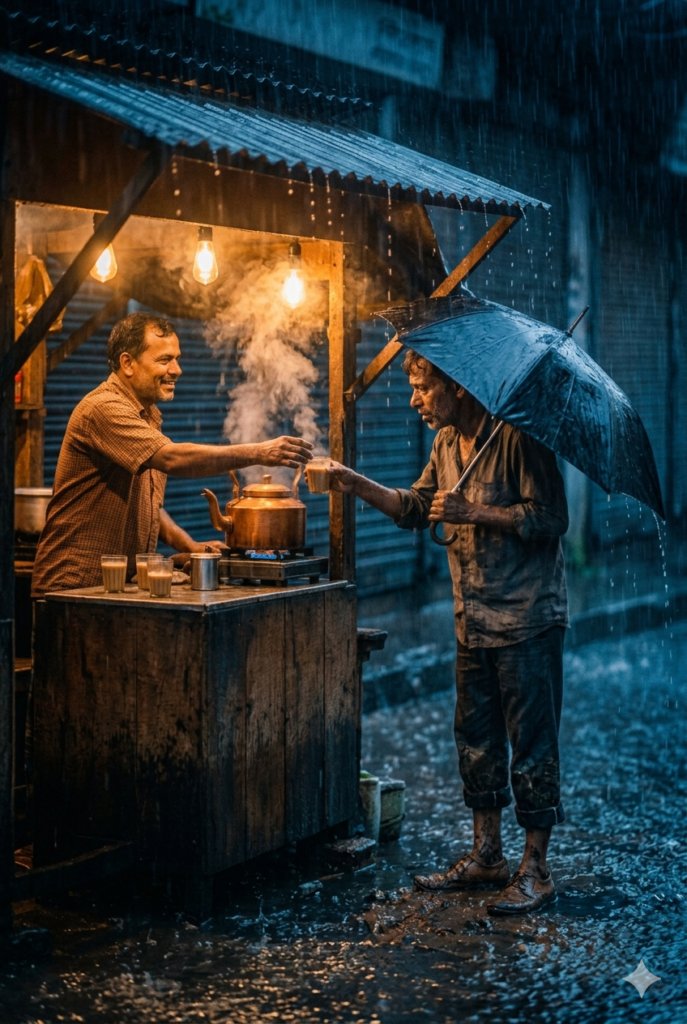 A cozy tea stall glowing warmly in contrast to cold blue rainy surroundings, steam from tea mixing with rain mist, vendor smiling while serving, cinematic color grading, ultra realistic lighting –ar 4:5