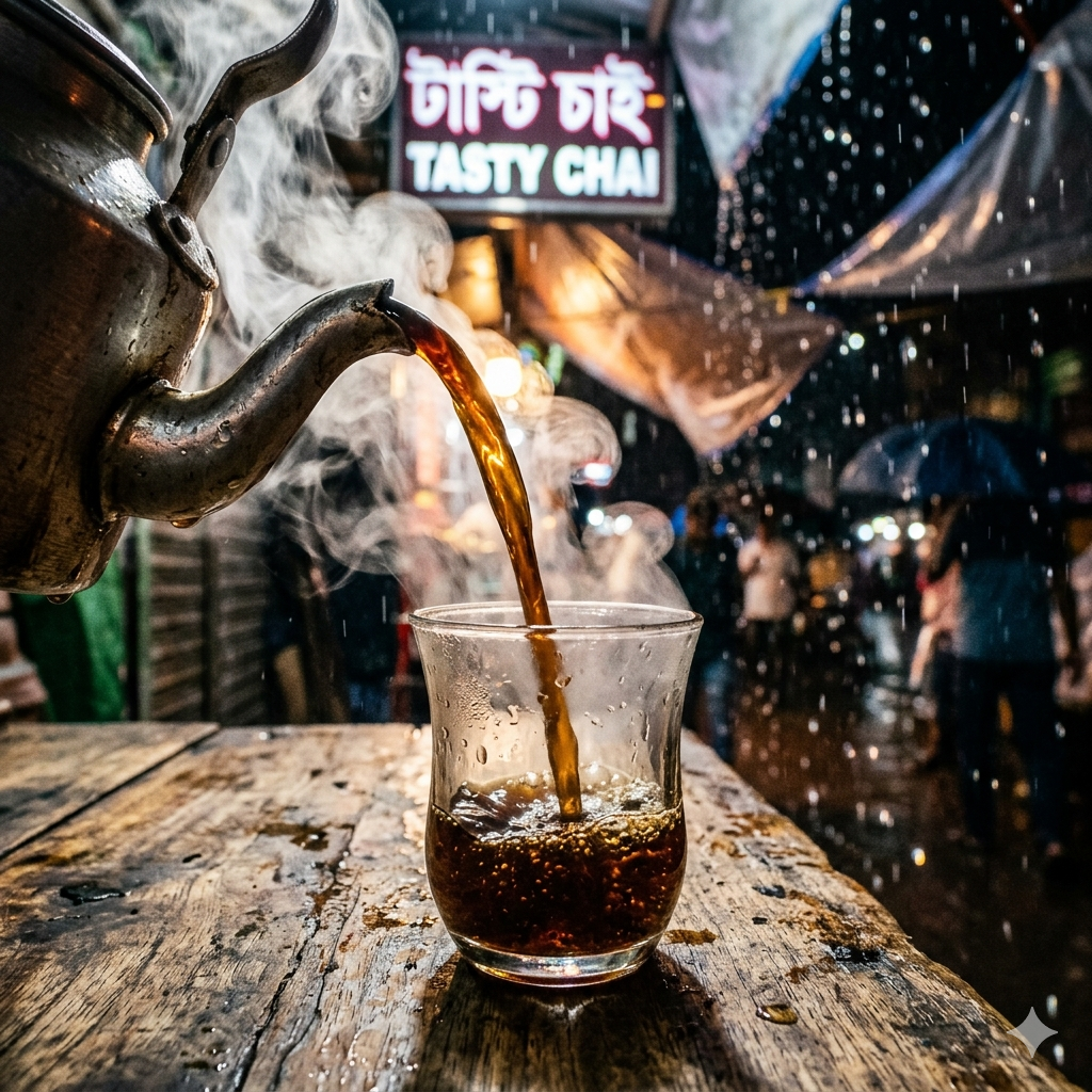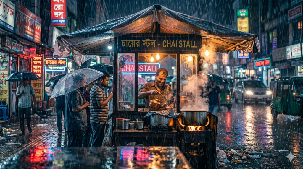 A cinematic street tea stall glowing under warm yellow light during heavy rain, steam rising from boiling tea in a metal pot, raindrops splashing on muddy ground, customers holding umbrellas, reflections on wet street, ultra realistic, shallow depth of field, 50mm lens –ar 4:5