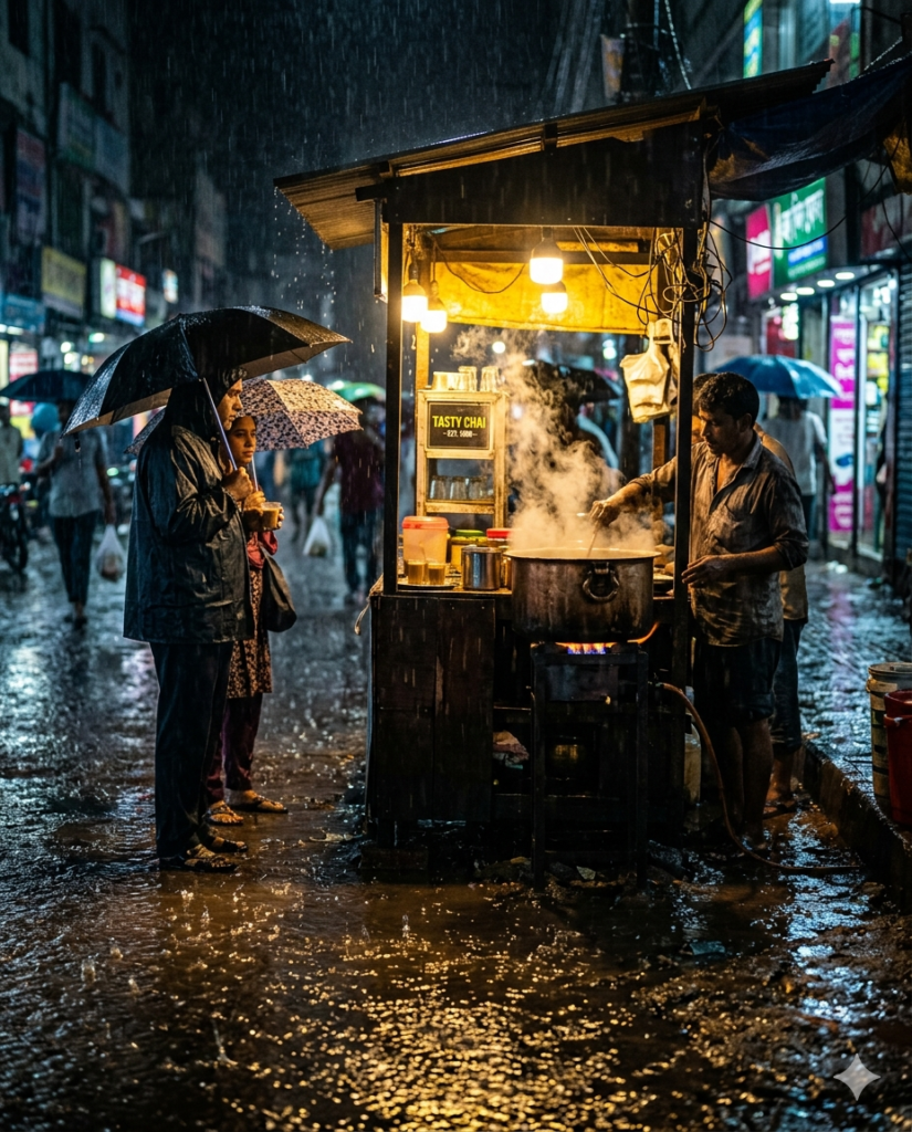 10 Cinematic Street Tea Stall in Rain Prompts for Google Gemini