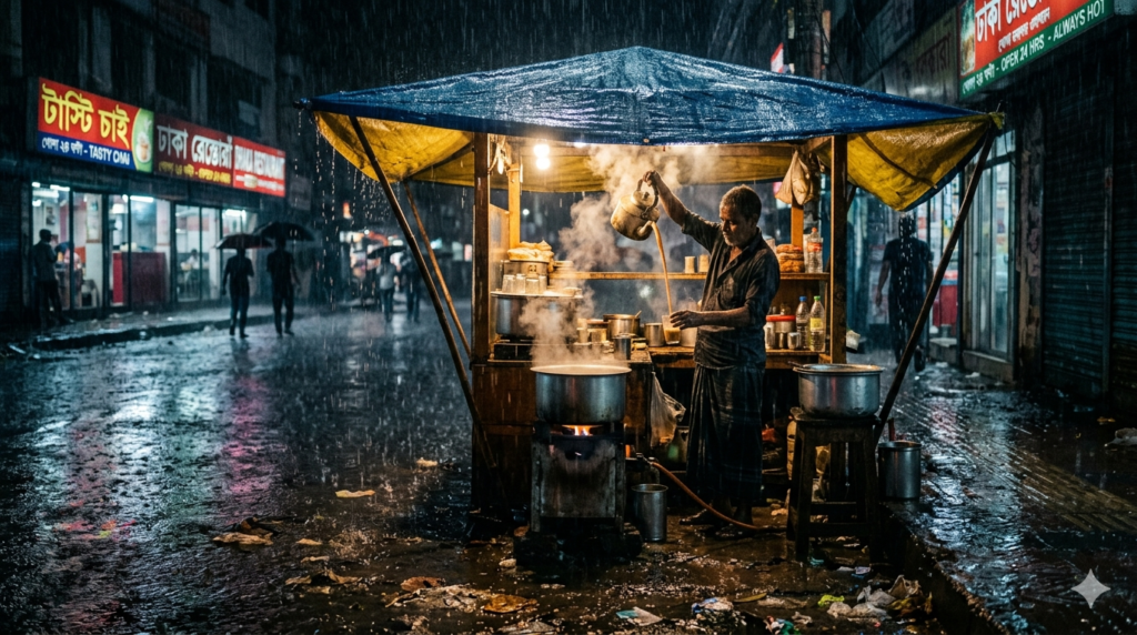 A candid moment of a passerby stopping at a rainy tea stall, dripping umbrella, muddy shoes, steam rising, natural expression, documentary photography style, highly realistic –ar 2:3