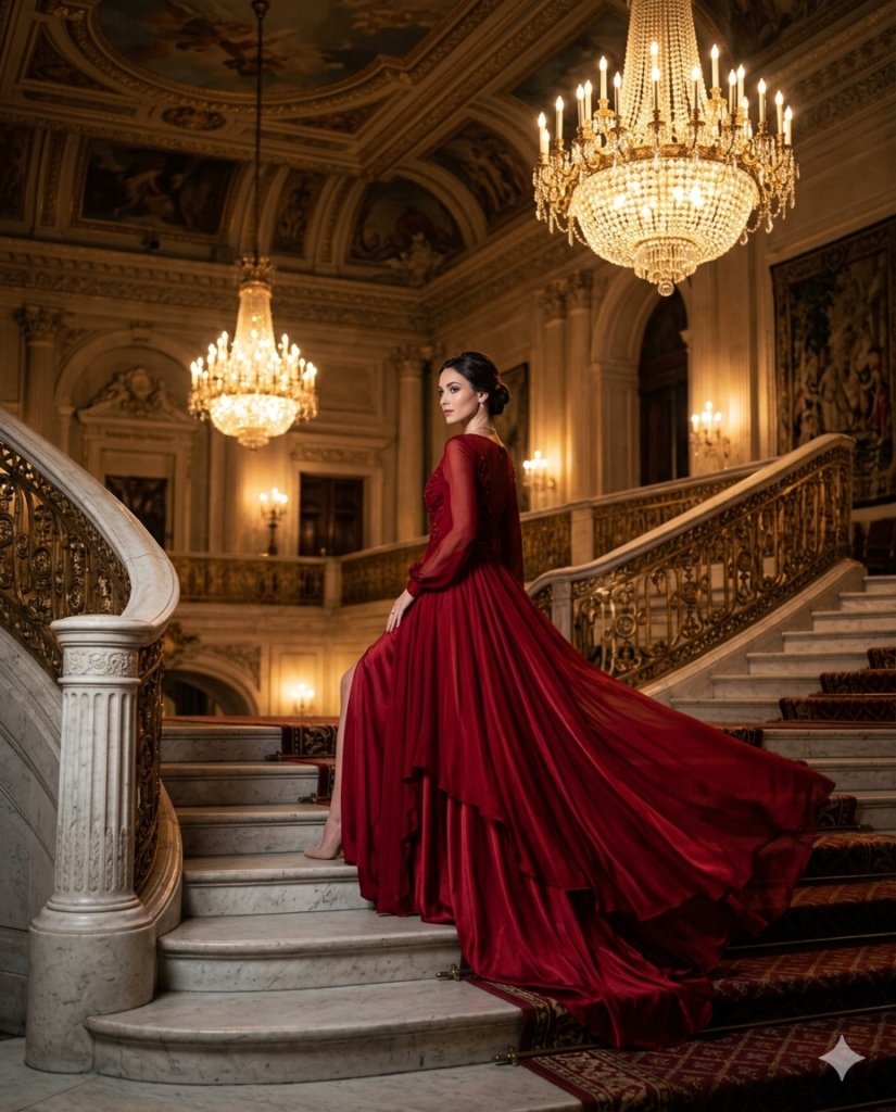 A stunning fashion photography shot of a model wearing an elegant flowing red evening gown standing on a marble staircase inside a luxurious palace hall, dramatic golden chandelier light illuminating the fabric texture, cinematic shadows, graceful pose, ultra-realistic fashion photography, 85mm lens, high detail, editorial magazine style –ar 4:5