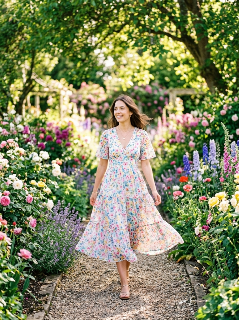 A bright summer fashion scene of a woman wearing a light floral dress walking through a blooming garden filled with colorful flowers, soft sunlight filtering through trees, natural candid movement, dreamy atmosphere, professional fashion photography, shallow depth of field, vibrant colors –ar 3:4