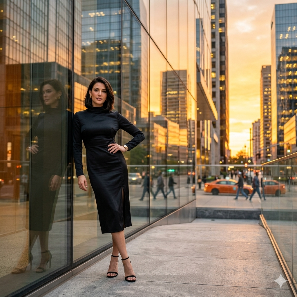 A stylish urban fashion portrait of a woman wearing a sleek black cocktail dress standing beside a modern glass building at sunset, reflections on the glass, warm golden hour lighting, confident pose, minimalistic fashion editorial style, ultra sharp details –ar 1:1