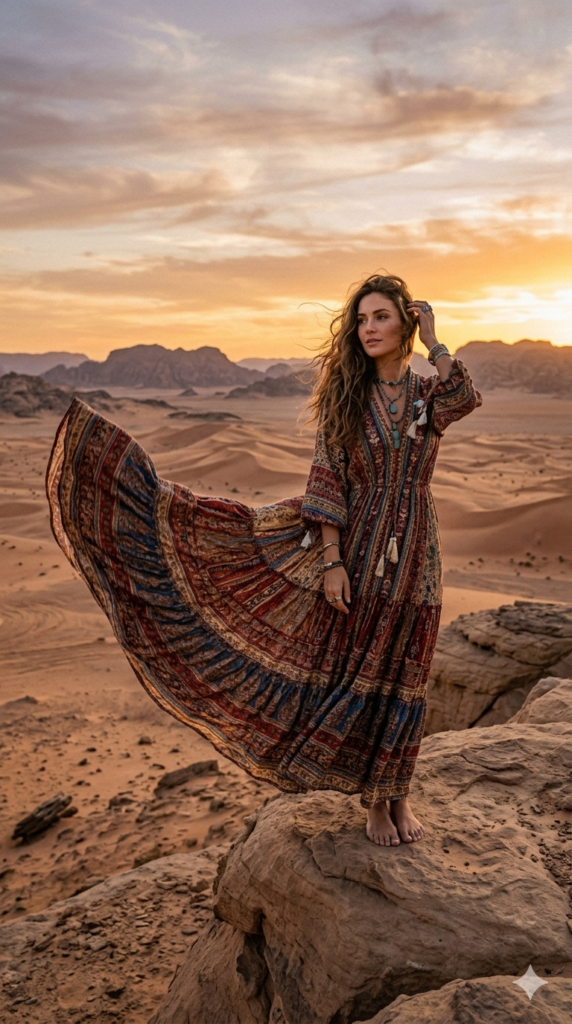 A bohemian fashion photoshoot of a woman wearing a flowing patterned maxi dress standing on a windy desert landscape, long dress fabric moving with the wind, warm sunset sky, cinematic lighting, artistic composition, lifestyle fashion photography –ar 9:16