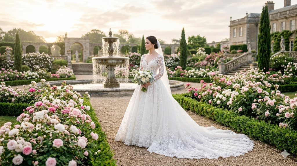 A breathtaking bridal fashion photograph of a bride wearing a luxurious white wedding gown standing in a grand garden with roses and fountains, soft morning light, elegant pose, ultra realistic textures, romantic atmosphere, high-end wedding magazine photography –ar 16:9