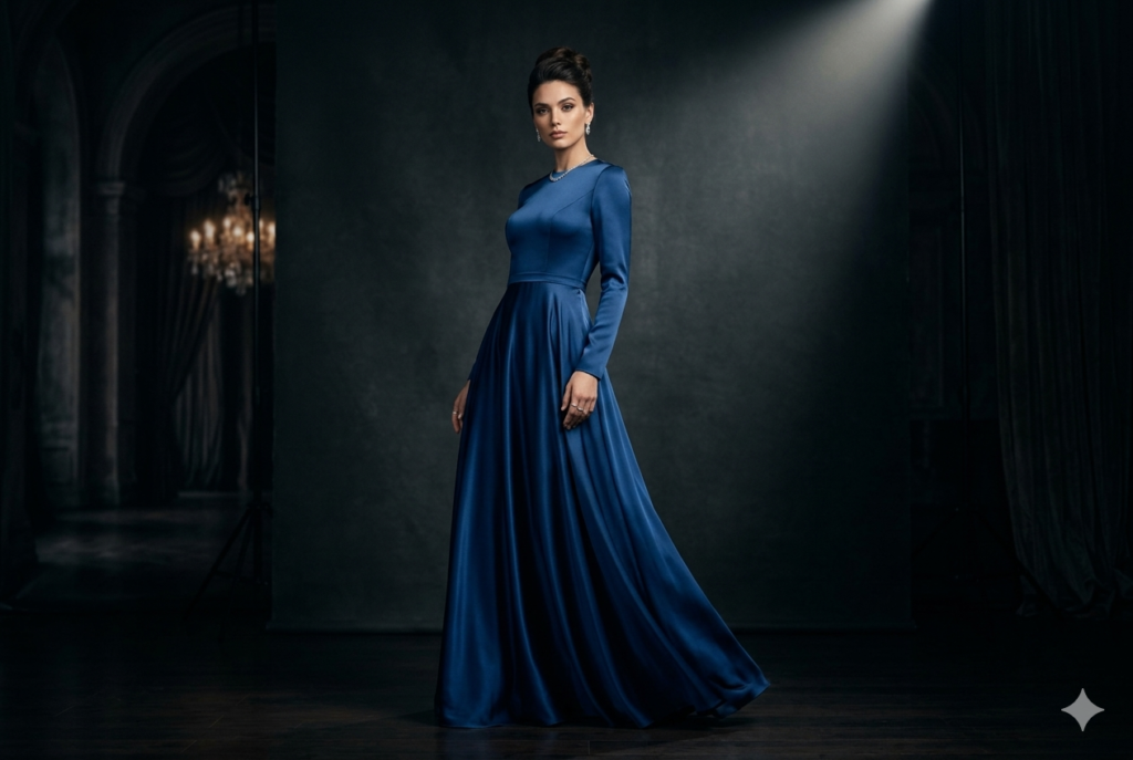 A high-end studio fashion portrait of a model wearing a luxurious silk evening dress, dramatic studio lighting, dark background, spotlight highlighting the smooth fabric texture, editorial fashion magazine quality, ultra detailed, professional lighting setup –ar 3:2