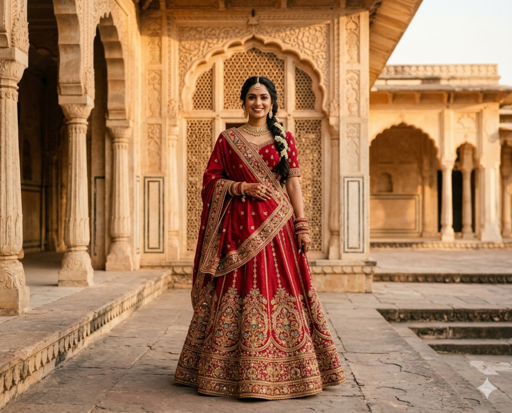 A beautiful cultural fashion portrait of a woman wearing an elegant traditional embroidered dress standing in front of historic architecture, warm sunlight, intricate fabric details clearly visible, cinematic composition, professional portrait photography –ar 5:4