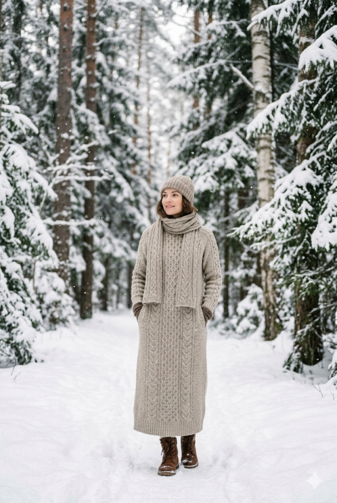 A cozy winter fashion photoshoot of a woman wearing a warm wool dress standing in a snowy forest, soft falling snowflakes, muted winter tones, natural soft lighting, peaceful atmosphere, professional lifestyle photography –ar 2:3