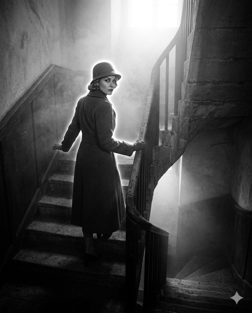 A mysterious 1930 stone staircase scene filmed from below. A woman quickly descends the steps while holding the railing, glancing back nervously as fog drifts through the stairwell. A strong light above creates a glowing halo around her silhouette –ar 4:5