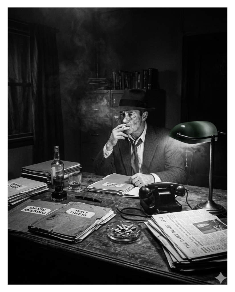 Create a classic 1940 private investigator office scene. A detective sits behind a cluttered desk covered with case files, a rotary phone, and an ashtray full of cigarettes. A single desk lamp illuminates the room while the rest fades into darkness –ar 4:5
