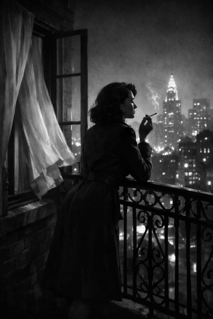 Create a melancholic noir photo of a woman standing on a wrought-iron balcony of a 1940 apartment building. She looks out over the glowing city skyline while holding a cigarette. Curtains blow softly from an open window –ar 4:5