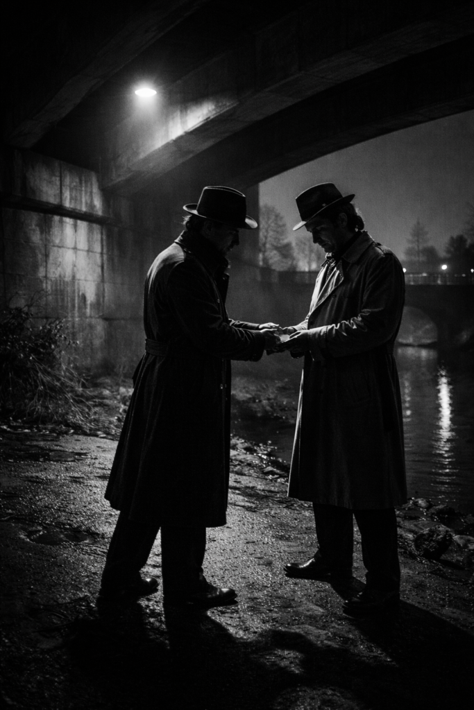Create a suspenseful nighttime scene under a concrete bridge. Two men wearing trench coats and fedoras meet beside a dark canal. One secretly hands something to the other while a harsh industrial light casts long shadows –ar 4:5