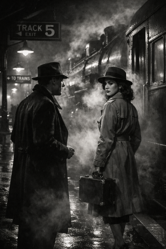 A cinematic 1940 film noir train station scene late at night. Steam from a vintage locomotive fills the platform while dim industrial lamps create long dramatic shadows across the ground. The camera frames a woman in a long trench coat and hat standing near the train door as a man step closer, hesitating as if about to say something important. She holds a small suitcase while looking back at him over her shoulder. Steam drifts between them, partially hiding their faces, creating tension and mystery like the final scene of a classic black-and-white crime film. Vintage signage, wet pavement reflections, dramatic lighting, authentic 1940 environment, cinematic film grain –ar 4:5