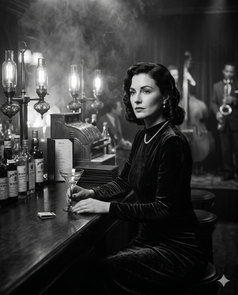 Create a moody black-and-white photo of a woman sitting alone at the end of a smoky 1940s jazz bar. She wears a velvet evening dress and pearl necklace while holding a martini glass. Old liquor bottles and vintage bar lamps glow softly behind her. Her expression is mysterious and unreadable. Shot from bar level, cinematic shadows, 50mm lens –ar 4:5