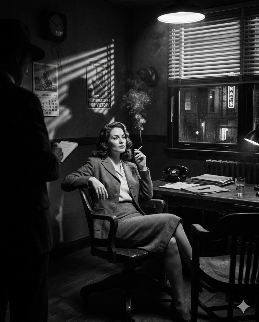 A dramatic 1940 interrogation scene inside a detective office. The camera sits slightly above eye level as a woman sits in a wooden chair beneath harsh lighting from venetian blinds. She leans back calmly while smoke from a cigarette curls into the air. Shadows stretch across the wall, creating intense tension like a classic crime movie –ar 4:5