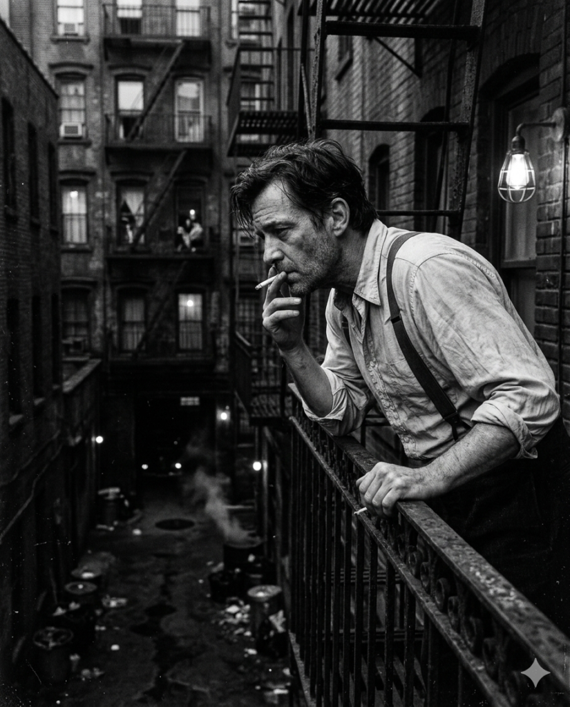 Create a gritty 1930 apartment building scene. A tired man leans forward on a metal fire escape railing, holding a cigarette between his fingers while looking down into the dark alley below. Suspenders over a wrinkled shirt, city fading into shadows –ar 4:5