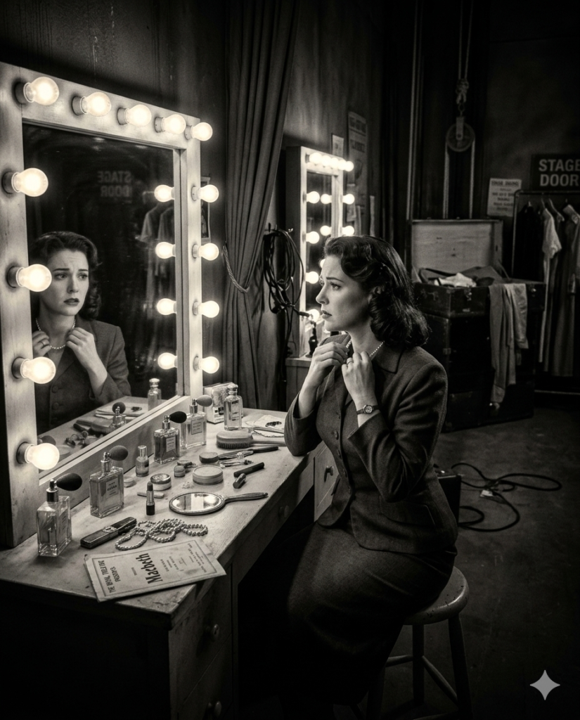 A dramatic 1940 theater backstage moment. The camera frames a woman sitting in front of a vanity mirror surrounded by glowing bulbs. She pauses while fastening a pearl necklace and looks at her reflection with a worried expression. Perfume bottles and makeup lie scattered on the table. Cinematic shadows fill the dressing room –ar 4:5