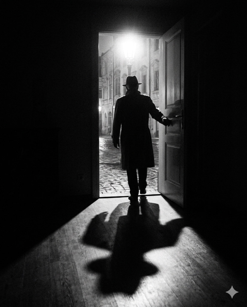 A suspenseful film noir doorway scene. Bright light spills through a half-open door while a man wearing a fedora slowly walks inside, his silhouette dominating the frame. The camera remains inside the dark room as his shadow stretches across the floor. Classic noir tension –ar 4:5