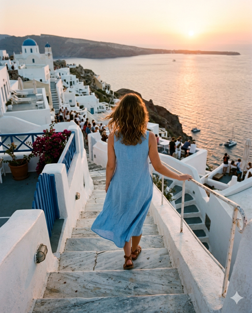 Create a natural travel photo of a young woman slowly walking down the white stone stairs of Santorini, Greece during sunset. She lightly holds the railing with one hand while looking toward the sea below. She is wearing a flowing light blue summer dress and leather sandals. Her hair moves slightly in the evening breeze. White buildings with blue domes surround the staircase and the Aegean Sea glows orange from the sunset. Shot from slightly above and behind her capturing both the steps and the ocean view. Soft golden hour lighting, realistic travel photography style. –ar 4:5