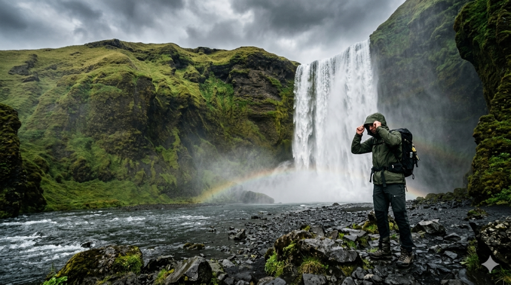 Create a cinematic wide travel photo of a traveler standing near Skógafoss waterfall in Iceland. The person is standing on wet black rocks adjusting the hood of their waterproof jacket while mist from the waterfall fills the air. They are wearing a dark green rain jacket, hiking pants, and rugged boots with a backpack. A rainbow appears faintly in the mist near the waterfall. The camera is positioned far back capturing the full height of the waterfall and the surrounding cliffs. Dramatic cloudy sky and powerful nature atmosphere. Epic adventure travel photography. –ar 16:9