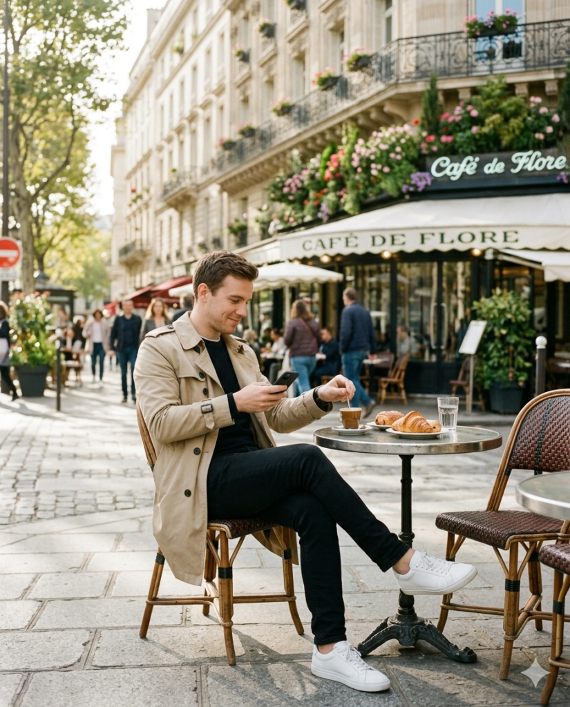 Create a candid travel photo of a young man sitting at a small outdoor café in Paris during a calm morning. He is leaning slightly back in his chair while stirring coffee and reading something on his phone. He is wearing a beige trench coat, black jeans, and white sneakers. Croissants and espresso sit on the table. Behind him are classic Parisian buildings and flower boxes. Soft morning sunlight illuminates the street creating a relaxed European atmosphere. Shot with a 50mm lens for natural lifestyle photography. –ar 4:5