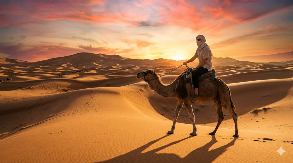 Create a wide cinematic travel photo of a traveler riding a camel across the golden sand dunes of the Sahara Desert in Morocco during sunset. The rider is slightly leaning forward while holding the saddle rope and looking toward the horizon. They are wearing a light scarf wrapped around the head, sunglasses, and loose desert clothing. Long camel shadows stretch across the dunes. The sky glows orange and pink as the sun sets behind distant dunes. Shot with a wide-angle lens capturing the scale of the desert landscape. –ar 16:9