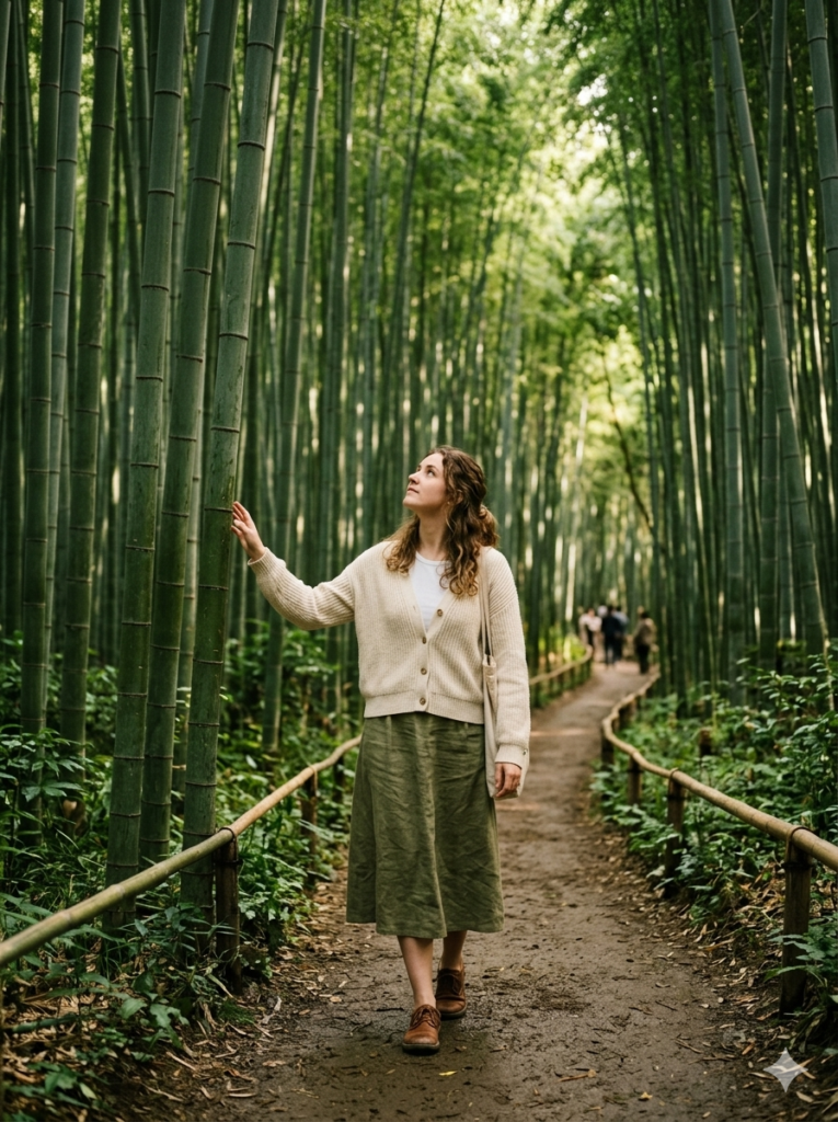 Create a peaceful travel photo of a young woman walking slowly through the Arashiyama bamboo forest in Kyoto, Japan. She is gently touching the tall bamboo stalks with her fingertips while looking upward. She is wearing a simple cream cardigan, long skirt, and comfortable walking shoes. Tall green bamboo towers above her creating a natural tunnel. Soft filtered sunlight shines through the leaves producing calm green tones. The camera positioned slightly ahead of her, capturing her upward gaze. Natural documentary travel photography style. –ar 3:4