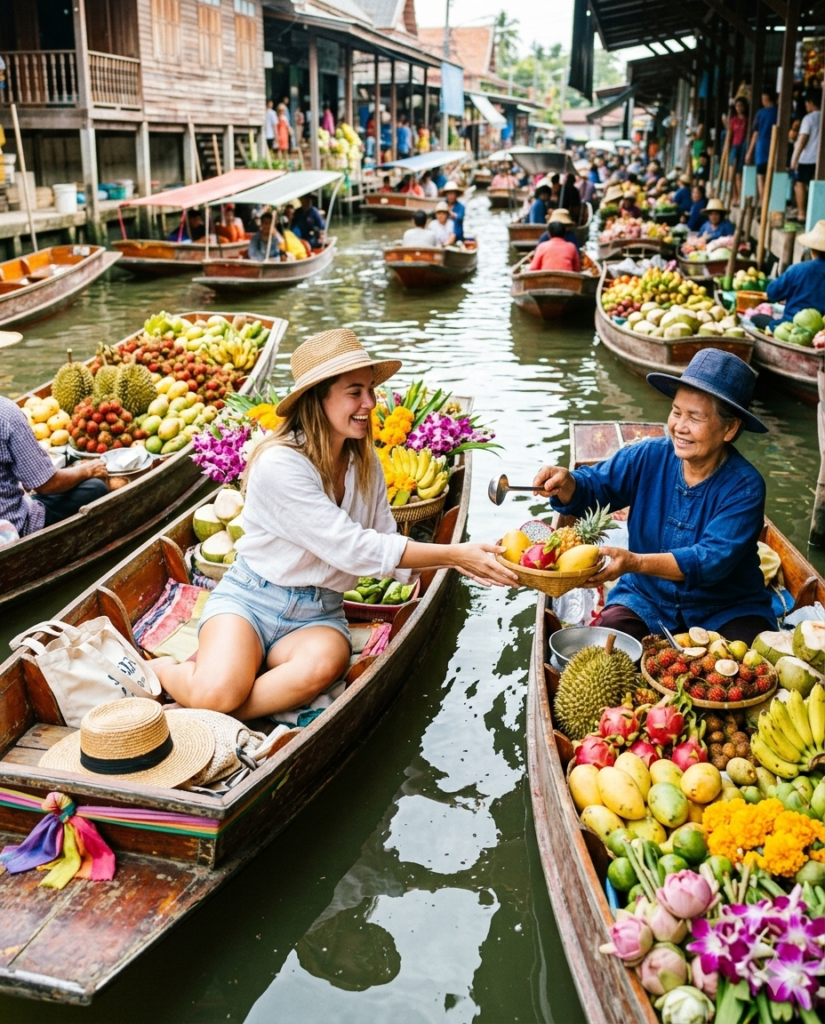 Create a vibrant travel photo of a young woman sitting inside a wooden boat at a floating market in Bangkok, Thailand. She is reaching toward a vendor’s boat to receive a bowl of fresh tropical fruit while smiling. She is wearing a straw hat, loose white blouse, and light denim shorts. Colorful fruits, vegetables, and flowers fill the surrounding boats. The water reflects bright colors from the market. Shot from slightly above capturing the interaction between boats. Natural daylight and lively market atmosphere. –ar 4:5