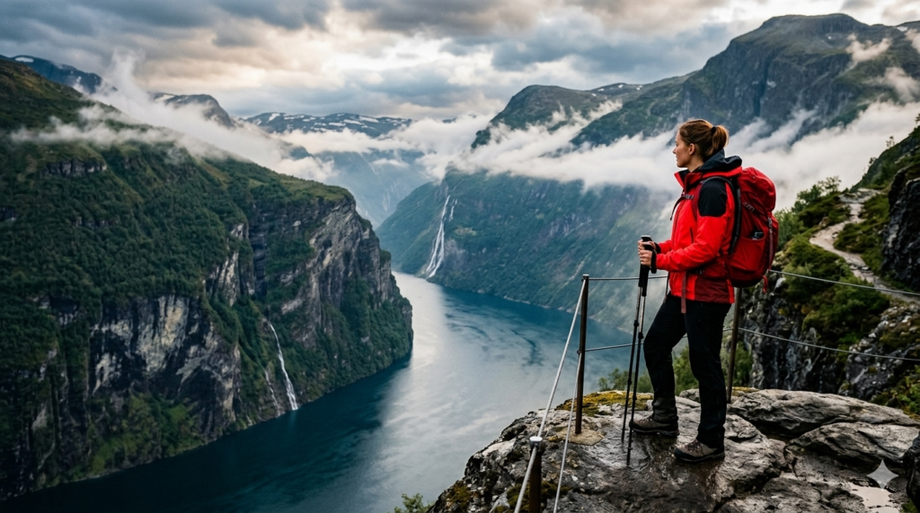 Create a dramatic travel photo of a hiker standing on a cliff overlooking a Norwegian fjord. The traveler is standing sideways with hands resting on trekking poles while gazing toward the deep blue water below. They are wearing a bright red hiking jacket and mountain boots. Steep cliffs and waterfalls surround the fjord while clouds move slowly through the valley. The camera is placed behind and slightly to the side capturing both the hiker and the breathtaking view. Epic adventure photography style. –ar 16:9