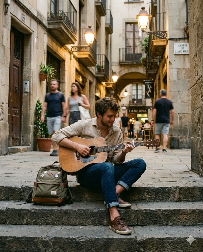 Create a lifestyle travel photo of a young traveler sitting on stone steps in Barcelona’s Gothic Quarter while playing a small acoustic guitar. One foot rests on a lower step while they lean slightly forward focused on the music. They are wearing a relaxed linen shirt, rolled-up jeans, and casual sneakers. Warm evening street lights illuminate the narrow historic alley. A few pedestrians walk past in soft blur behind them. Natural storytelling street photography. –ar 4:5