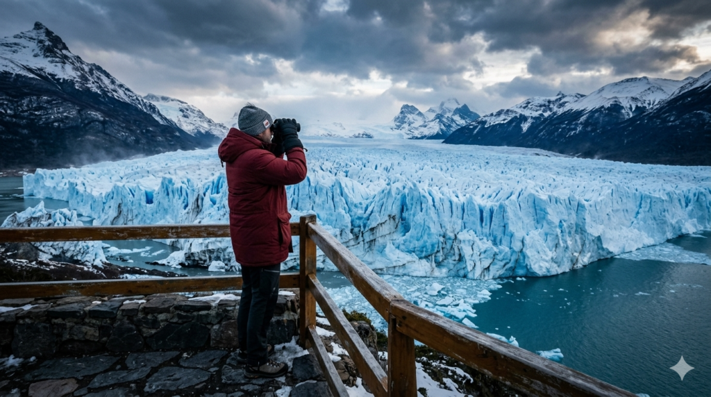 Create a cinematic travel photo of a traveler standing near the edge of a glacier viewpoint in Patagonia, Argentina. The traveler is holding binoculars while scanning the icy landscape ahead. They are wearing a thick winter jacket, gloves, and a wool hat. Massive blue ice formations and snow-covered mountains stretch across the background. Wind blows lightly across the frozen landscape. Shot from behind the traveler capturing the scale of the glacier environment. Cold dramatic lighting and epic wilderness travel photography. –ar 16:9